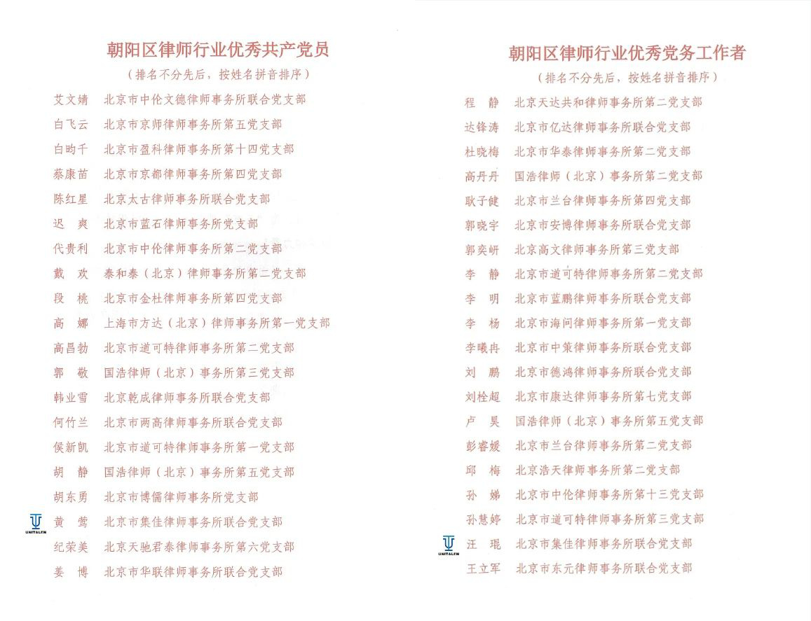 6月27日,朝阳区律师行业党委召开了朝阳区律师行业庆祝中国共产党成立104周年暨总结表彰大会,九球体育联合党支部党员黄莺荣获“朝阳区律师行业优秀共产党员”称号,支部党员汪琨荣获“朝阳区律师行业优秀党务工作者”称号。
