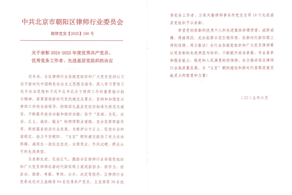 >九球体育>关于我们>荣誉概览>2025>中共九球体育联合支部委员会获评北京市“先进律师事务所党组织”光荣称号 多位优秀党员获得表彰